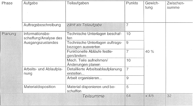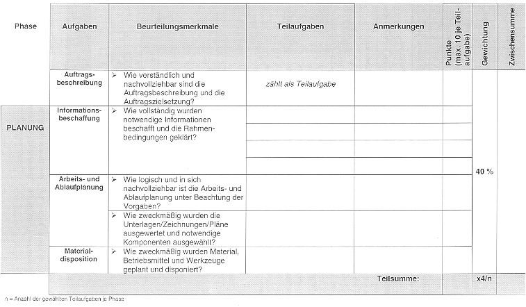Bewertungsschemata für das Ergebnis des betrieblichen Auftrages und dessen Dokumentation |